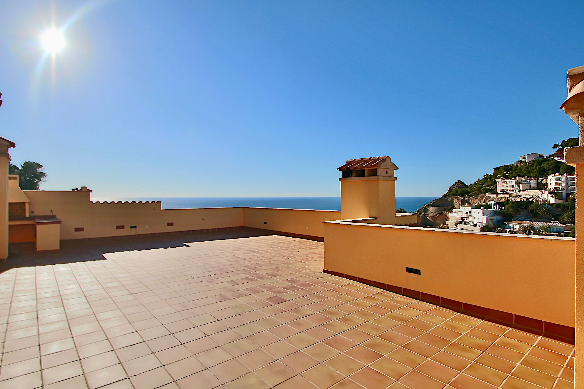 Furthermore, the penthouse is equipped with an open fitted kitchen, fireplace, fitted wardrobes, guest toilet, air conditioning hot/cold, underfloor heating in the bathrooms, guest toilette, tiled floors, BBQ with summer kitchen on the roof terrace and a 2 open parking spaces. The complex offers elevators and 2 community pools.